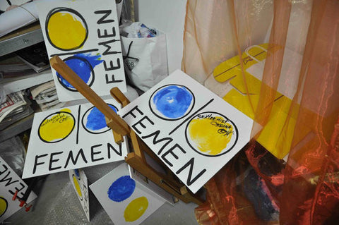 Le logo de FEMEN sur une toile imprimé avec nos poitrines, signé par les activistes.